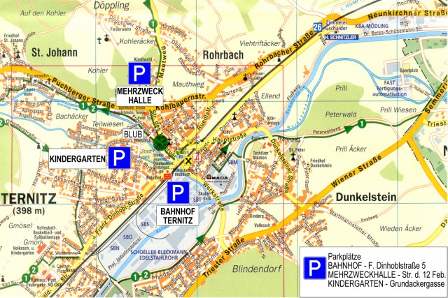 Bitte benutzen Sie auch die nur wenige Minuten entfernten, kostenlosen Parkplätze im Umfeld, etwa bei der Mehrzwecksporthalle oder kommen Sie am besten überhaupt gleich zu Fuß oder mit dem Fahrrad!
