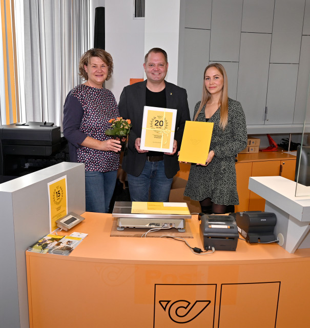 Die Urkunde anlässlich des 20-jährigen Jubiläums wurde nun feierlich von Ramona Nather, Postpartner-Betreuerin der Österreichischen Post AG, an LAbg. Bürgermeister Mag. Christian Samwald und Mitarbeiterin Anja Stocker übergeben.