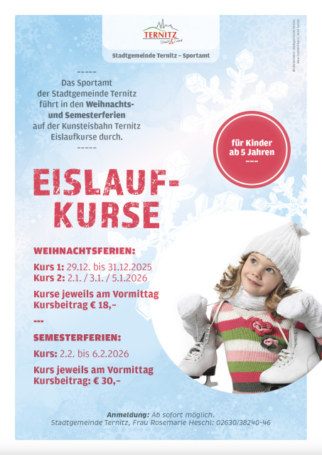 Das Sportamt der Stadtgemeinde Ternitz führt in den Weihnachts- und Semesterferien auf der Kunsteisbahn Ternitz Eislaufkurse durch.